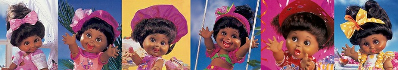 Galoob not only didn't have enough sense of what's politically correct, these days, to give the black dolls names and identities of their own, but not knowing what to do in the group cross sell photo on the back of the box, they didn't give the black dolls Any Names at all! This was not only insensitive, in our racially sensitive society, but It was bad merchandising too. A child may buy a different colored friend for her doll, but not a different colored Clone! Next Page: 25. Eye Trouble |